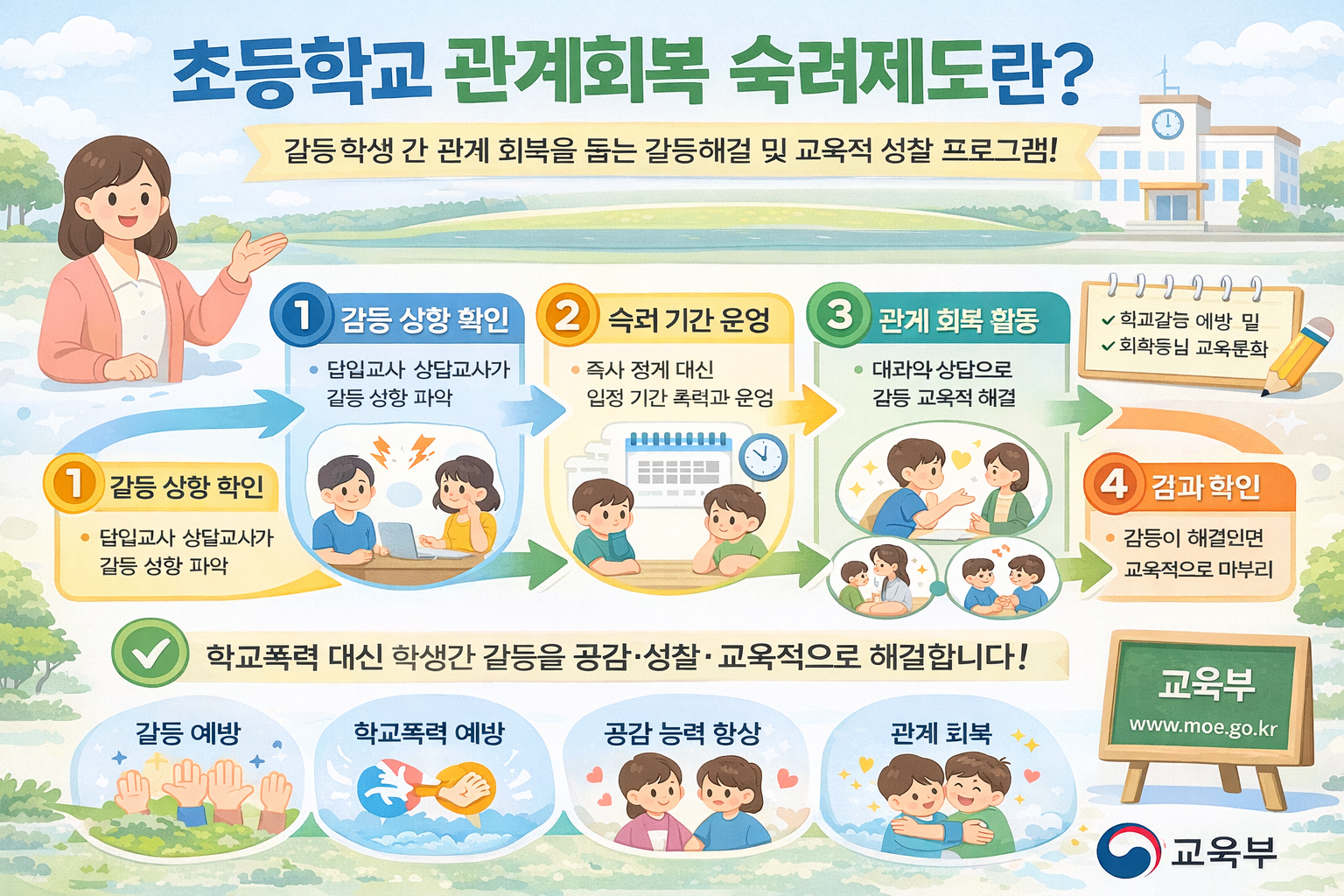 최근 학교 현장에서 학생 간 갈등 해결 방식이 크게 변화하고 있습니다. 단순 처벌이 아닌 관계 회복을 중심으로 한 교육적 접근이 주목받고 있는데요. 2024년부터 본격 확대된 '관계회복 숙려제도'가 바로 그 핵심입니다. 전국 초등학교에서 시행되고 있는 이 제도는 갈등을 교육의 기회로 전환하려는 새로운 시도로, 학부모와 교육계의 관심이 집중되고 있습니다.