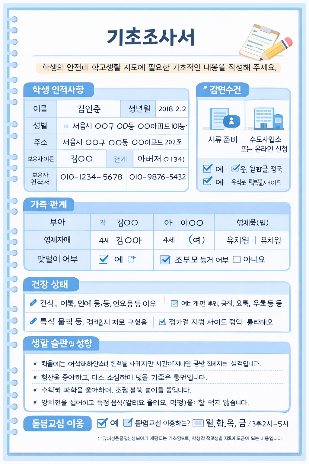 직접 겪어본 바로는, 이 표를 참고하여 작성하니 누락 없이 꼼꼼하게 작성할 수 있었습니다. 특히 건강 정보는 과거 병원 진료 기록을 참고하여 정확히 기재했고, 이후 학교에서 연락이 왔을 때 신속히 대응할 수 있었습니다.
