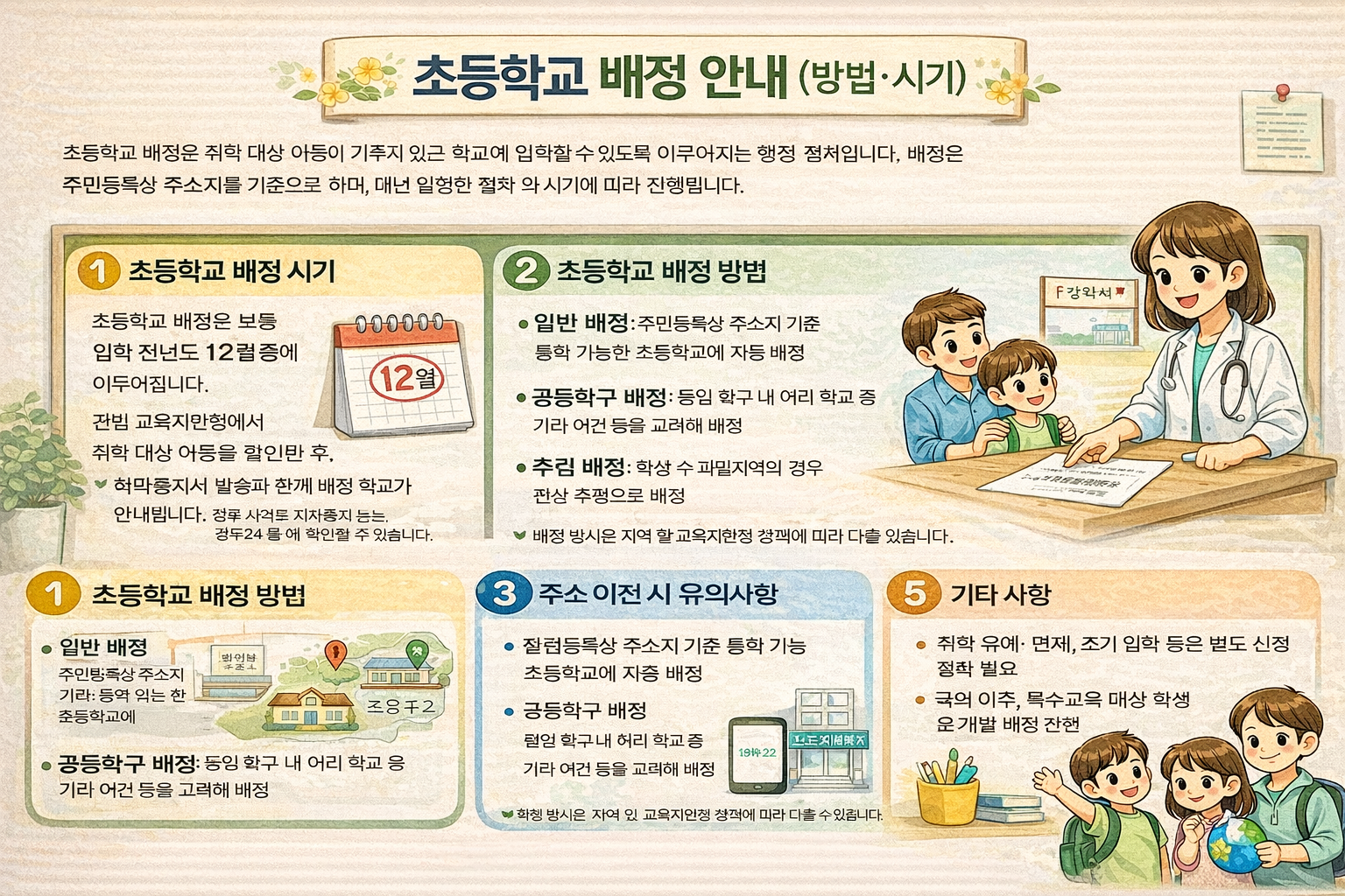 자녀의 초등학교 입학을 앞둔 학부모님들에게 가장 중요한 관심사 중 하나는 바로 학교 배정입니다. 초등학교 배정은 취학 대상 아동이 거주지 인근 학교에 입학할 수 있도록 이루어지는 행정 절차로, 주민등록상 주소지를 기준으로 매년 일정한 절차와 시기에 따라 진행됩니다. 배정 시기를 놓치거나 주소 변경에 따른 절차를 제대로 이해하지 못하면 원하는 학교 배정에 어려움을 겪을 수 있기 때문에, 사전에 정확한 정보를 파악하는 것이 필수적입니다.
