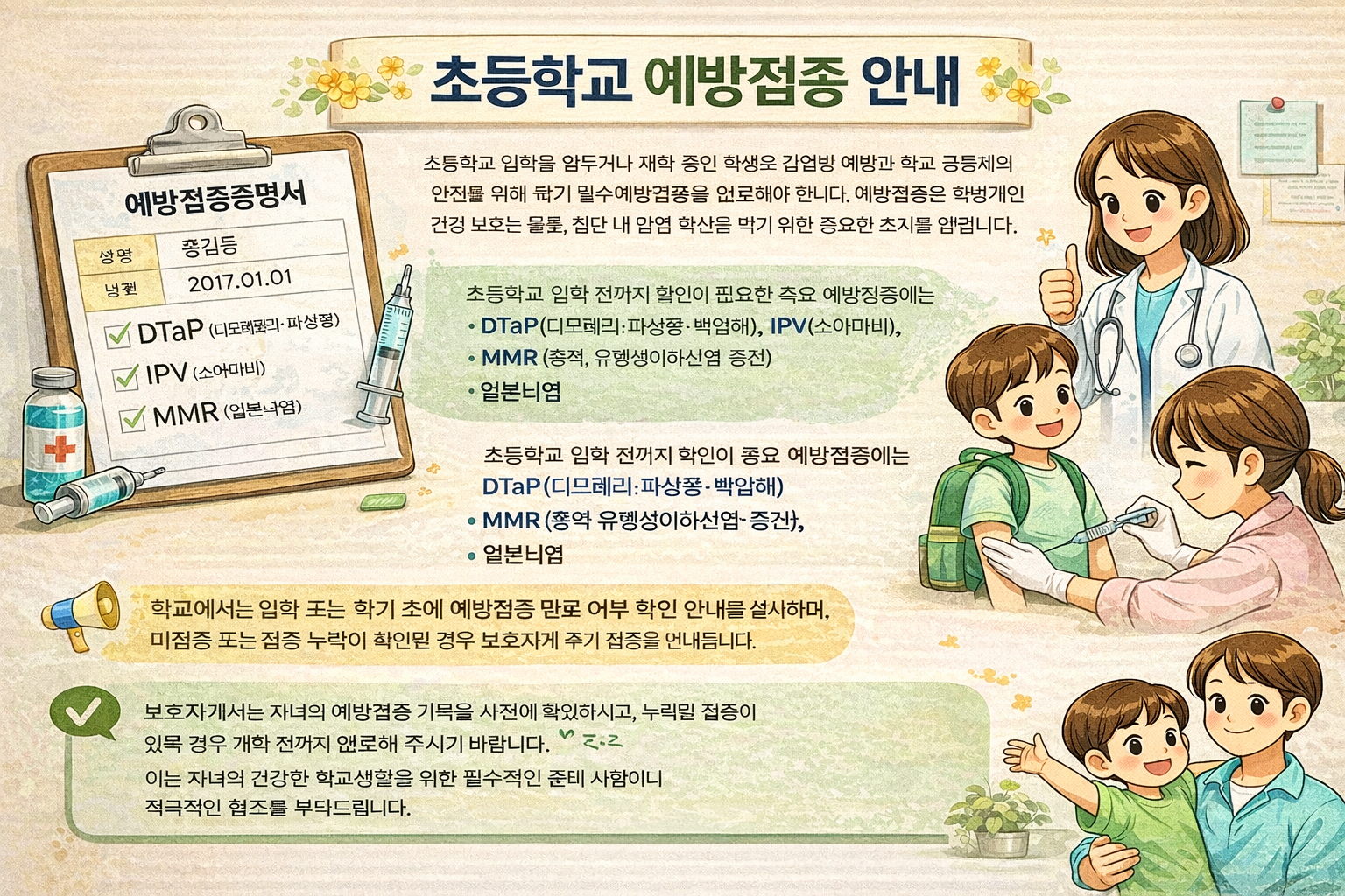 중요한 점은 확인사업 대상 예방접종 기록이 예방접종도우미 누리집에서 정상적으로 확인되는 경우, 학교에 별도의 예방접종증명서를 제출할 필요가 없다는 것입니다. 이는 행정 편의성을 높이고 보호자의 부담을 줄이기 위한 조치로, 전산시스템과 학교 간 연계를 통해 자동으로 확인이 이루어집니다. 다만 전산등록이 되어 있지 않거나 누락된 경우에는 추가 조치가 필요하므로, 개학 전 미리 접종 내역을 확인하는 것이 중요합니다. 특히 초등학교 입학을 앞둔 학부모의 경우 DTaP(디프테리아·파상풍·백일해), IPV(소아마비), MMR(홍역·유행성이하선염·풍진), 일본뇌염 등 필수 접종 항목을 반드시 점검해야 합니다.