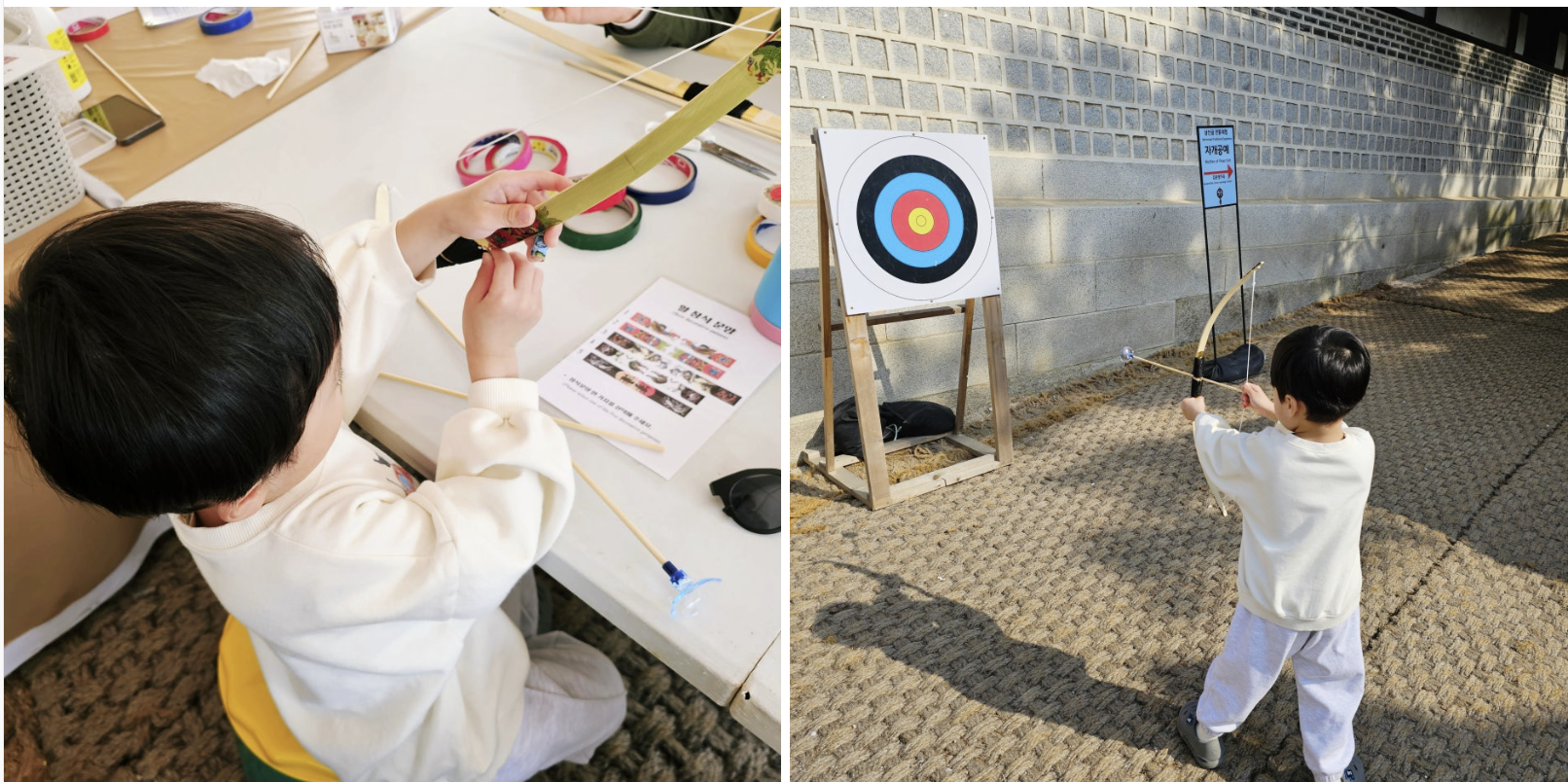 특히 활 만들기 체험은 아이뿐만 아니라 저도 함께 참여해 더욱 의미 있는 시간이 되었습니다. 직접 만든 활로 과녁을 맞추는 체험 공간이 별도로 마련되어 있어 아이가 집중하며 즐거워하는 모습이 인상적이었습니다.