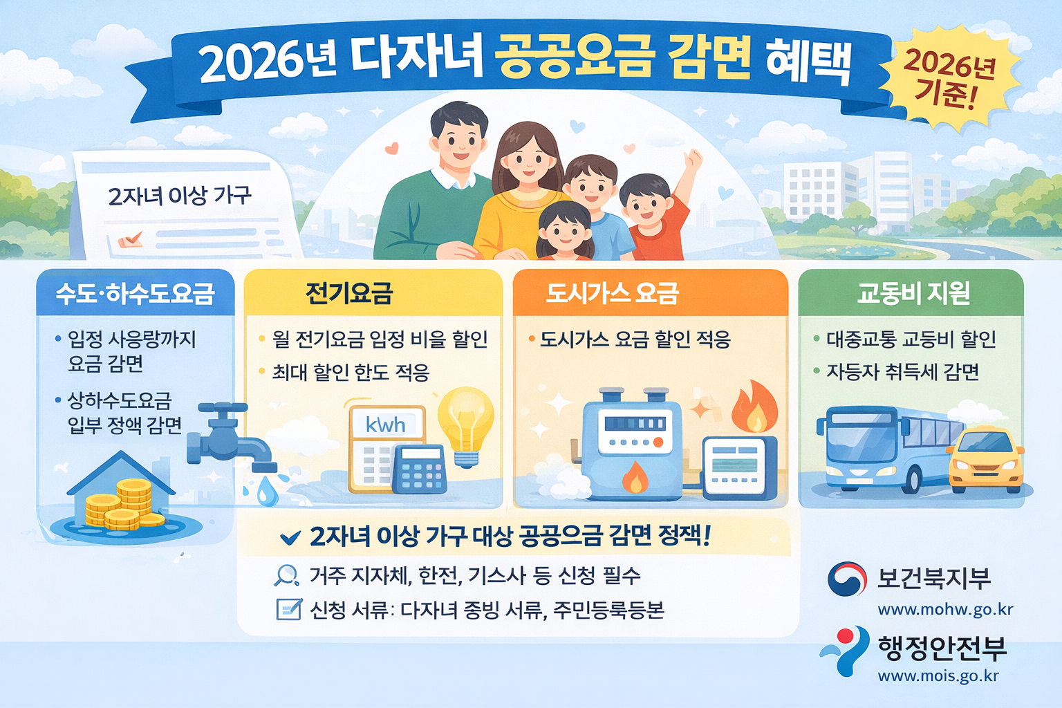 여러분은 매달 얼마나 많은 공공요금을 내고 계신가요? 다자녀 가구라면 전기요금, 수도요금, 가스요금이 일반 가구보다 훨씬 높을 수밖에 없습니다. 그런데 이 부담을 상당 부분 줄일 수 있는 방법이 있다는 걸 알고 계셨나요?