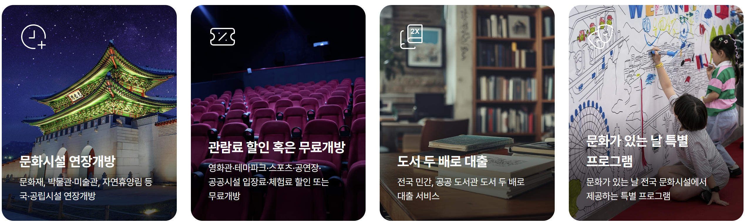 대표적으로 영화관 할인, 공연 티켓 할인, 전시 무료 또는 할인 관람, 도서관 프로그램 운영 등이 포함됩니다.